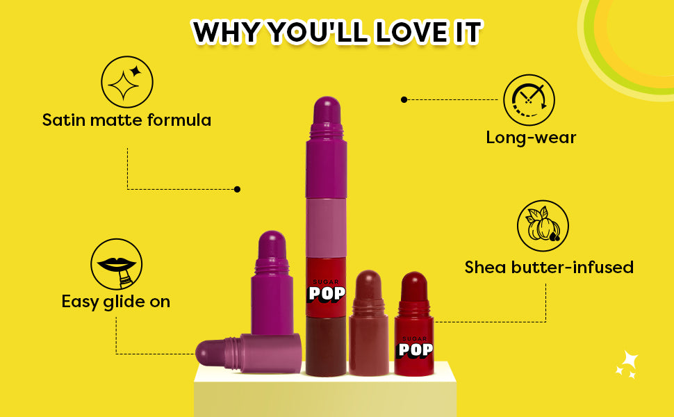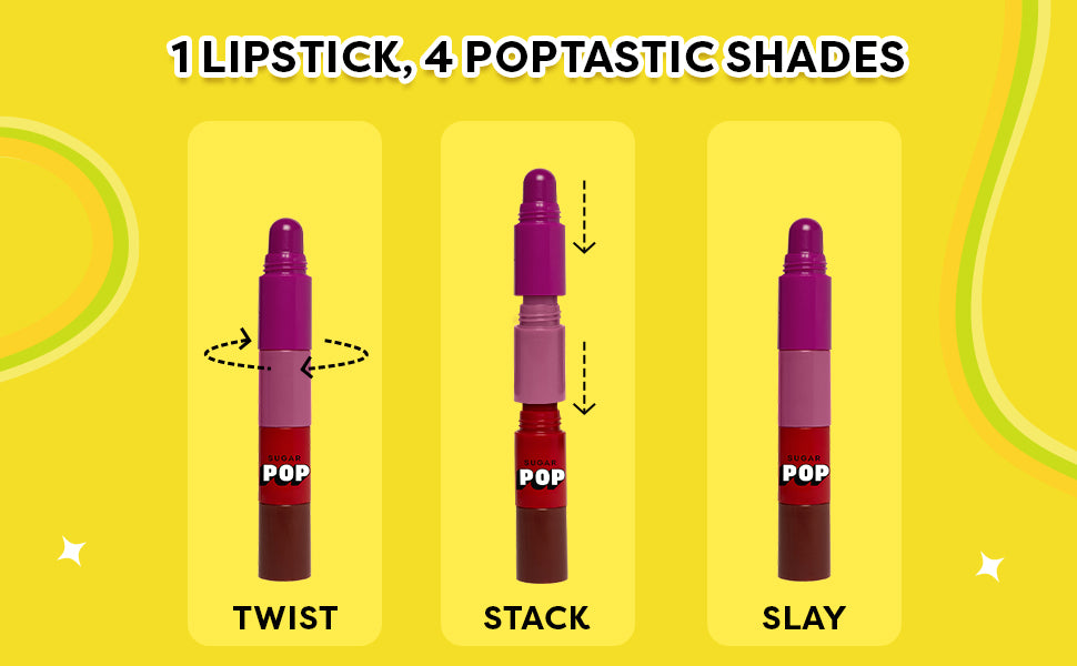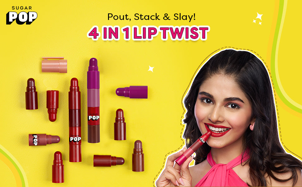 Lipstick lovers pay close attention! With SUGAR POP 4 in 1 Lip Twist you can have it all! This unique packaging houses 4 stunning lippies to choose from and flaunt your pout anytime, anywhere. From subtle nudes to bold hues, this stackable lipstick has versatile shades to suit all skin tones. What's more? Infused with hyaluronic acid, shea butter and jojoba oil goodness, these lightweight lipsticks keep your lips soft and smooth. The satin matte texture glides on smoothly and offers full coverage in just one swipe. Be desk to dinner ready in a jiffy because this multi-purpose genius can be used as a blush or an eyeshadow. Just stack this in your bag for all your on-the-go beauty needs!