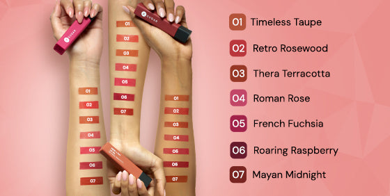 A. Available in 7 buildable shades, ranging from nudes, pinks and to red and browns. The shades 01 Timeless Taupe, 03 Thera Terracotta, and 07 Mayan Midnight flatter dusky skin tone.