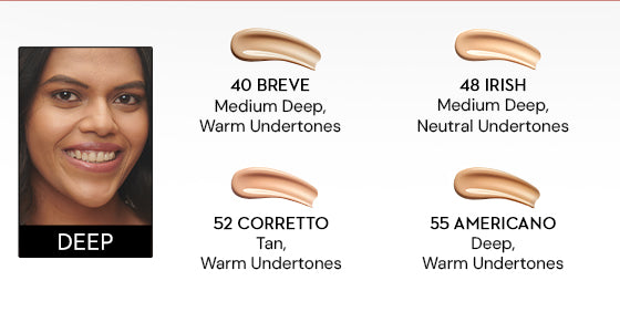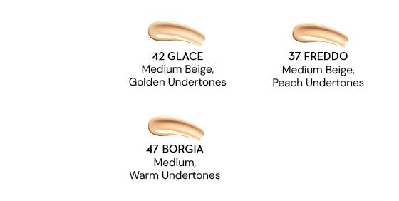 (Medium Beige, Peach Undertones, 40 Breve (Medium Deep, Warm Undertones), 42 Glace (Medium Beige, Golden Undertones), 47 Borgia (Medium, Warm Undertones), 48 Irish (Medium Deep, Neutral Undertones), 52 Corretto (Tan, Warm Undertones), 55 Americano (Deep, Warm Undertones).