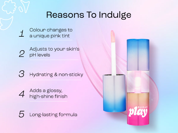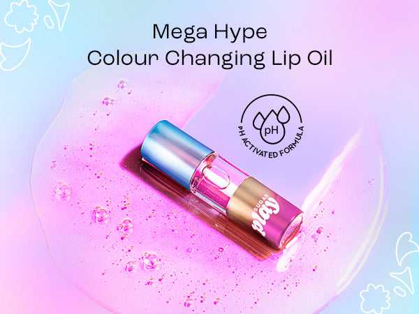 Meet SUGAR Play Mega Hype Colour Changing Lip Oil! This hydrating, clear formula transforms into a pretty pink shade that complements your skin tone in just one swipe. Adjusting to your skin's pH levels within seconds, this juicy, shiny lip oilm gives your pout and cheeks a naturally flushed, dewy pink radiance. Infused with squalane, jojoba oil and vitamin E, this ultra-hydrating Mega Hype Colour Changing Lip Oil gives you all the TLC, tint and twinkle in one go! Plus, you’ll totally *heart* its non-sticky, long-lasting and smooth gliding formula that hugs your lips.