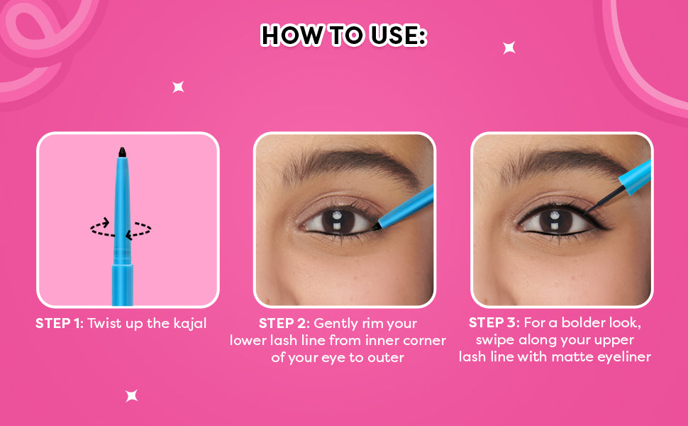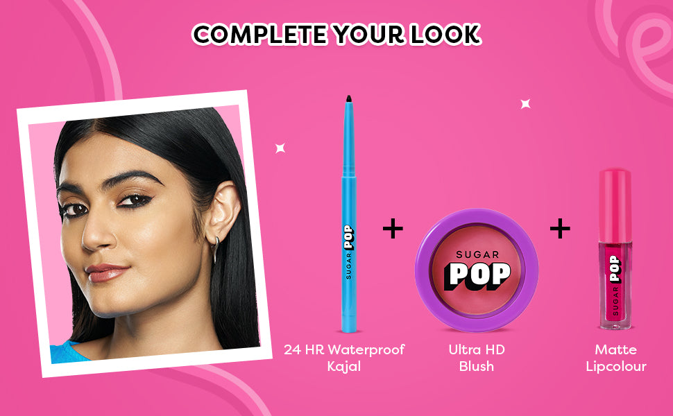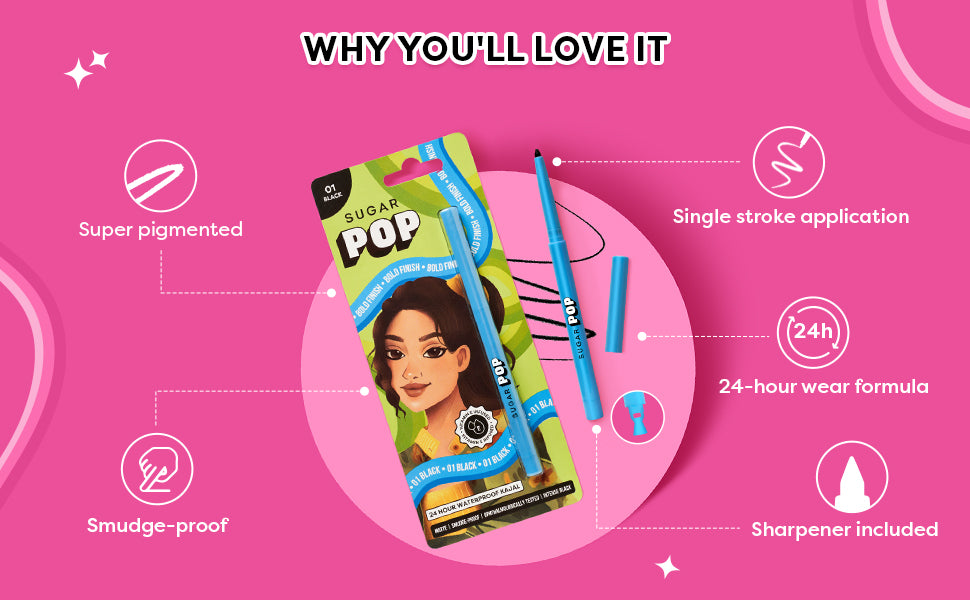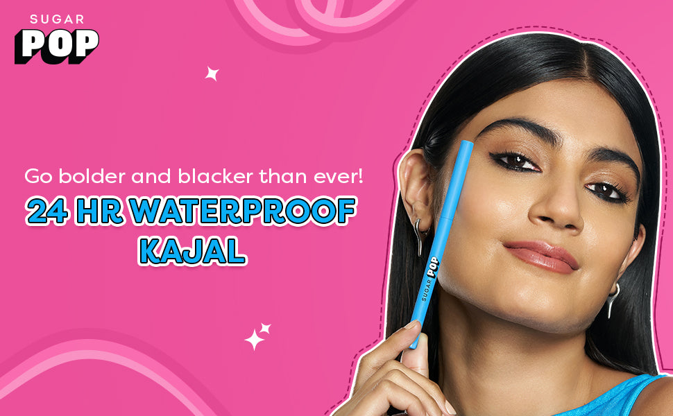 Go bolder and blacker than ever with our SUGAR POP 24 Hr Waterproof Kajal. From bustling mornings to wee hours of the night, our waterproof formula refuses to smudge, fade or back down for up to 24 hours. The intense matte finish and unmatched pigmentation is here to stir up some eye-catching drama and command attention. But that's not all! The skin-loving ingredients like aloe vera and vitamin E, make it a smooth glide and all time comfortable wear formula for sensitive eyes and contact lens wearers.