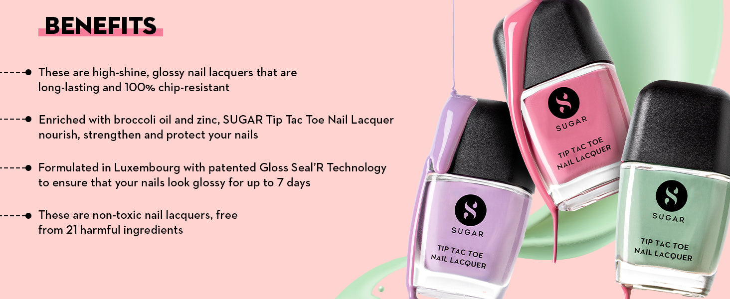 A. SUGAR Tip Tac Toe Nail Lacquers are toxin-free and totally safe for your nails. Formulated in Luxembourg (Europe), our 100% vegan nail lacquers have the goodness of broccoli oil and zinc to nourish, protect and prevent any nail damage.