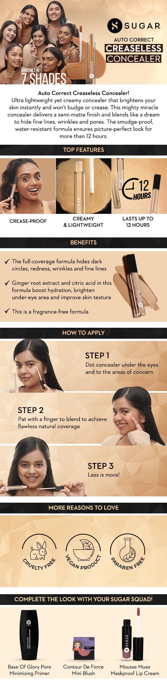 A. The main key is to create a smooth canvas for your concealer and other base makeup to go flawless. Start by double cleansing your face and follow it up with a hydrating moisturizer and then serum. Want to get soft skin with an illuminating glow? Try our Bling Leader Illuminating Moisturizer that protects your skin from pollution and leaves it super smooth and glowing. Post prepping your skin, apply the concealer to the areas of your concern. Our Auto Correct Creaseless Concealer blends into the skin seamlessly and stays put throughout the day. Never forget to set your base with a translucent setting powder to lock the look.