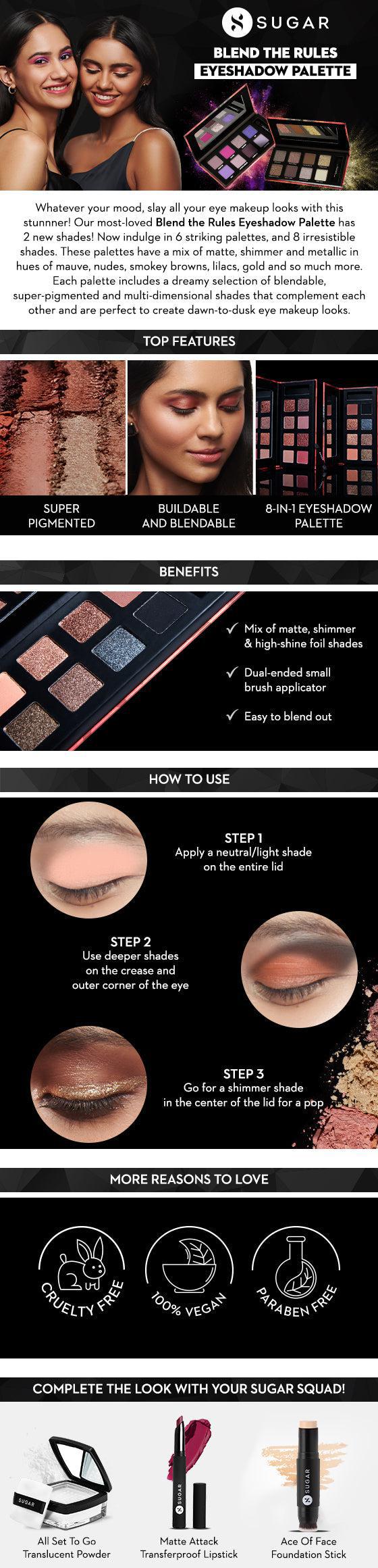 Q. What kind of shades do these eyeshadow palettes have?A. All the palettes in our Blend The Rules Eyeshadow Palette range have a mix of matte, shimmer and metallic hues that are perfect to create a sultry, smokey or festive glam eye makeup looks. If you want a cosmic eye makeup look with a hint of bright hues, then you must try our Blend The Rules Eyeshadow Palette in the shade '06 Starlight' which has bright pinks and shimmery purples. If you are looking for a more sophisticated eye makeup look, then you must get your hands on Blend The Rules Eyeshadow Palette in the shade '01 Flawless' or '04 Fetish Nudes'. We have 6 different palettes with lovely colour themes, so now you can create and experiment with your eye makeup just the way you want!