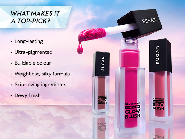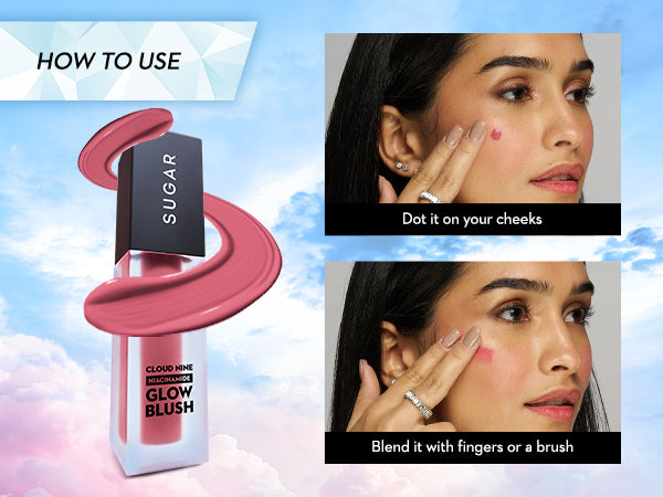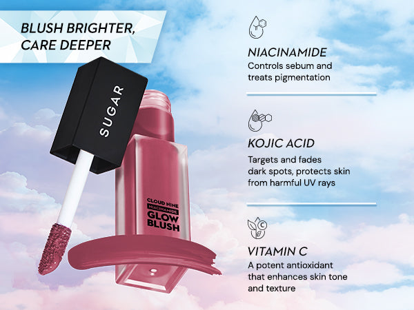 Meet Cloud Nine Niacinamide Glow Blush with a skin-care-infused nourishing formula that blends seamlessly to give you dewy, flushed cheeks in one swipe. This liquid blush with a serum-like texture has a blend of 8 botanical oils along with skin-loving ingredients like niacinamide, kojic acid, and amla extracts to brighten, hydrate and care for your skin. Create your custom dewy blush look with this buildable, super-pigmented formula that layers and blends without streaking. Just a few dots are all you need to uplift your complexion with a radiant wash of colour.