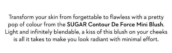 Additional Details: The SUGAR Contour De Force Mini Blush comes in 4 pretty shades viz., 01 Peach Pink, 02 Pink Pinnacle, 03 Mauve Marvel.This product is free from parabens, D5, oil, mineral oil and nano-ingredients.