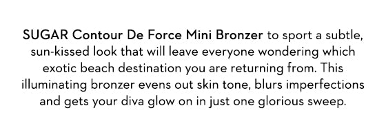 SUGAR Contour De Force Mini Bronzer Ingredients: Talc, Mica, Dimethicone, Octyldodecyl Stearoyl Stearate, Isostearyl Neopentanoate, Zinc Stearate, Polybutene, Caprylyl Glycol, Phenoxyethanol, Hexylene Glycol, Isopropyl Isostearate, Tocopherol, Lecithin, Ascorbyl Palmitate, Glyceryl Stearate, Glyceryl Oleate, Citric Acid, May Contain: Iron Oxides, Red 7 Lake.