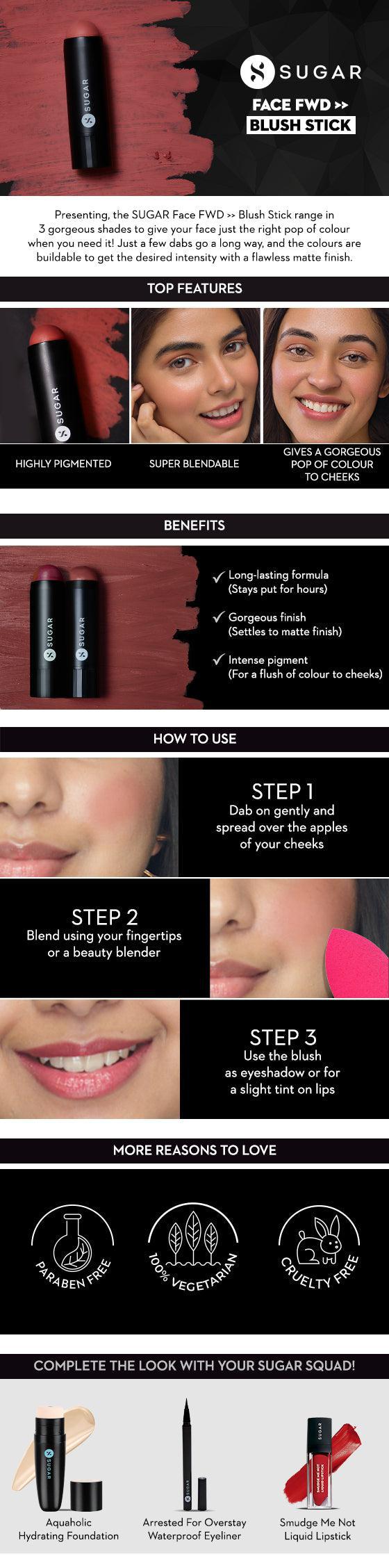 Additional details: SUGAR Face FWD >> Range comprises of 5 stunning products - Face FWD >> Primer Stick, Face FWD >> Corrector Stick (in 3 shades), Face FWD >> Contour Stick (in 2 shades), Face FWD >> Blush Stick (in 3 shades), and Face FWD >> Highlighter Stick (in 3 shades).