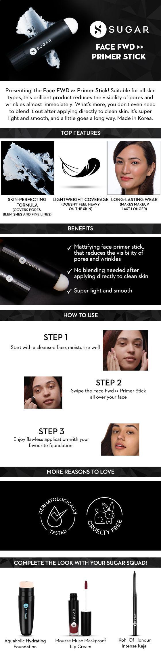 Additional details: SUGAR Face FWD >> Range comprises of 5 stunning products - Face FWD >> Primer Stick, Face FWD >> Corrector Stick (in 3 shades), Face FWD >> Contour Stick (in 2 shades), Face FWD >> Blush Stick (in 3 shades), and Face FWD >> Highlighter Stick (in 3 shades).