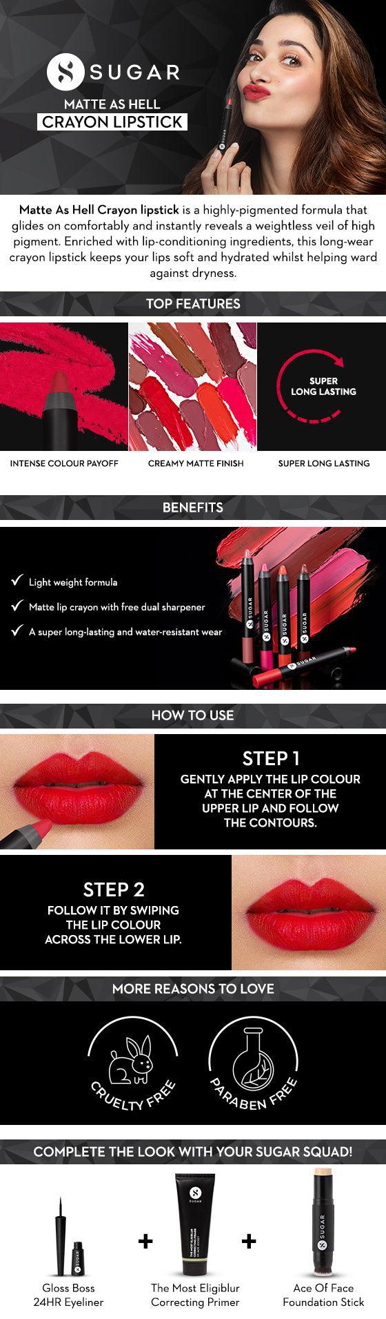 A. This crayon lipstick comes with a super matte & comfortable finish. When its full coverage formula meets creamy texture, all you get is pout perfection. To achieve a perfect pout, never forget to prep and prime.