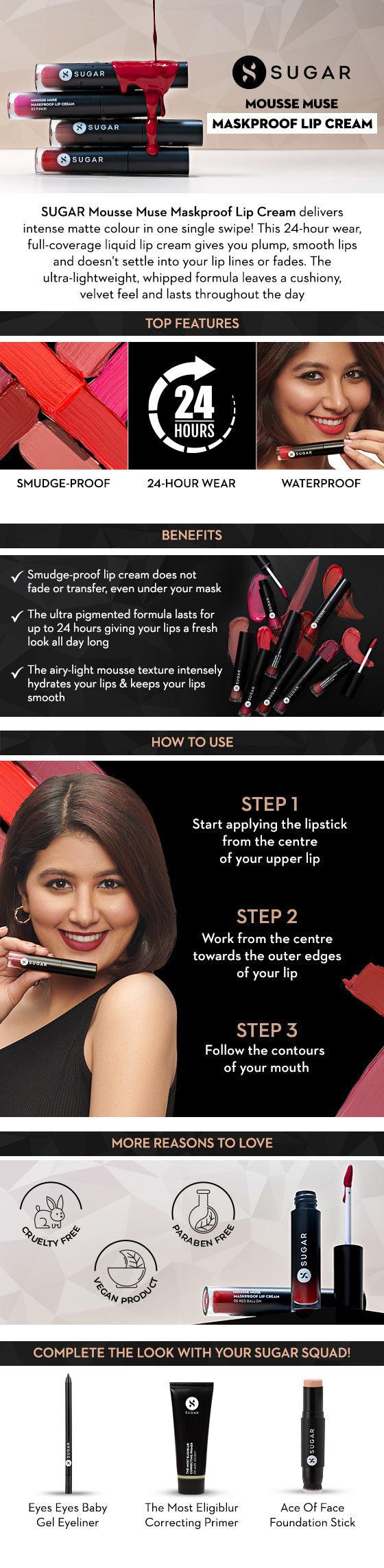 - Step 2: Moisturize Your Lips - SUGAR Mousse Lip Cream hydrates your lips, but depending on your lip type. To ward off any signs of dryness and add a boost of hydration, use our Tipsy Lip Moisturizing Balm. Available in 7 lip-smacking variants, these are enriched with vitamin E, jojoba oil, shea butter, and SPF, which keep dry, chapped lips at bay.