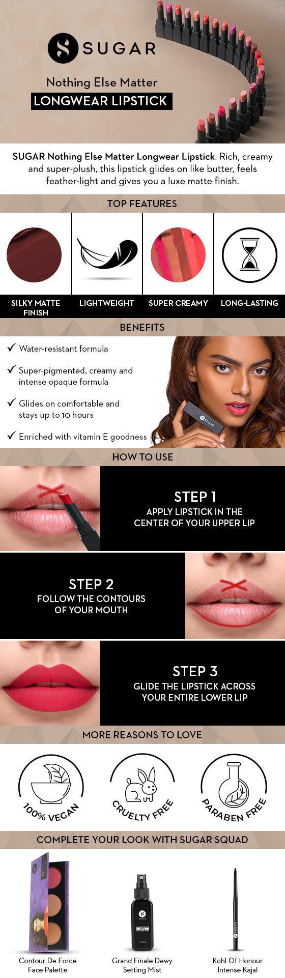 A. SUGAR Nothing Else Matter Lipstick stays on comfortably on your lips for up to 10-hours. The super creamy formula will not smudge or smear even on your longest days. Thus, it is an ideal lipstick for everyday wear.
