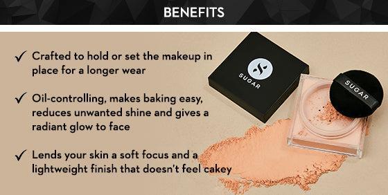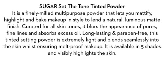 SUGAR Set The Tone Tinted Powder comes in a range of 5 irresistible tints viz. 10 Latte (light), 15 Cappuccino (light-medium), 30 Chococcino (medium), 45 Con Panna (medium-deep), 55 Americano (deep).This product is dermatologically tested, approved and 100% safe for your skin.