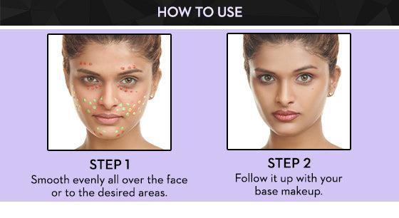 A. Since this product offers the benefits of a face primer and colour corrector, you can use it as the first step in your makeup routine. Follow it up with your foundation and other makeup products. Do note to choose the right shade when opting for this colour correcting primer. Find your shade below:
